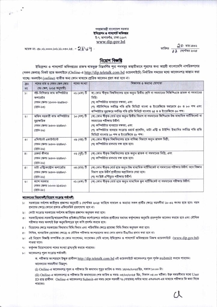 ইমিগ্রেশন ও পাসপোর্ট অধিদপ্তরের রাজস্ব খাতভুক্ত নিম্নবর্ণিত শূন্য পদসমূহ অস্থায়ীভাবে পূরণের জন্য আগ্রহী বাংলাদেশি নাগরিকগণের (সকল জেলার) নিকট হতে অনলাইনে (Online-এ http://dip.teletalk.com.bd ওয়েবসাইটে) নির্ধারিত সময়ের মধ্যে আবেদনপত্র আহ্বান করা যাচ্ছে। অনলাইন (online) ব্যতীত অন্য কোন মাধ্যমে প্রেরিত আবেদন গ্রহণ করা হবে না।