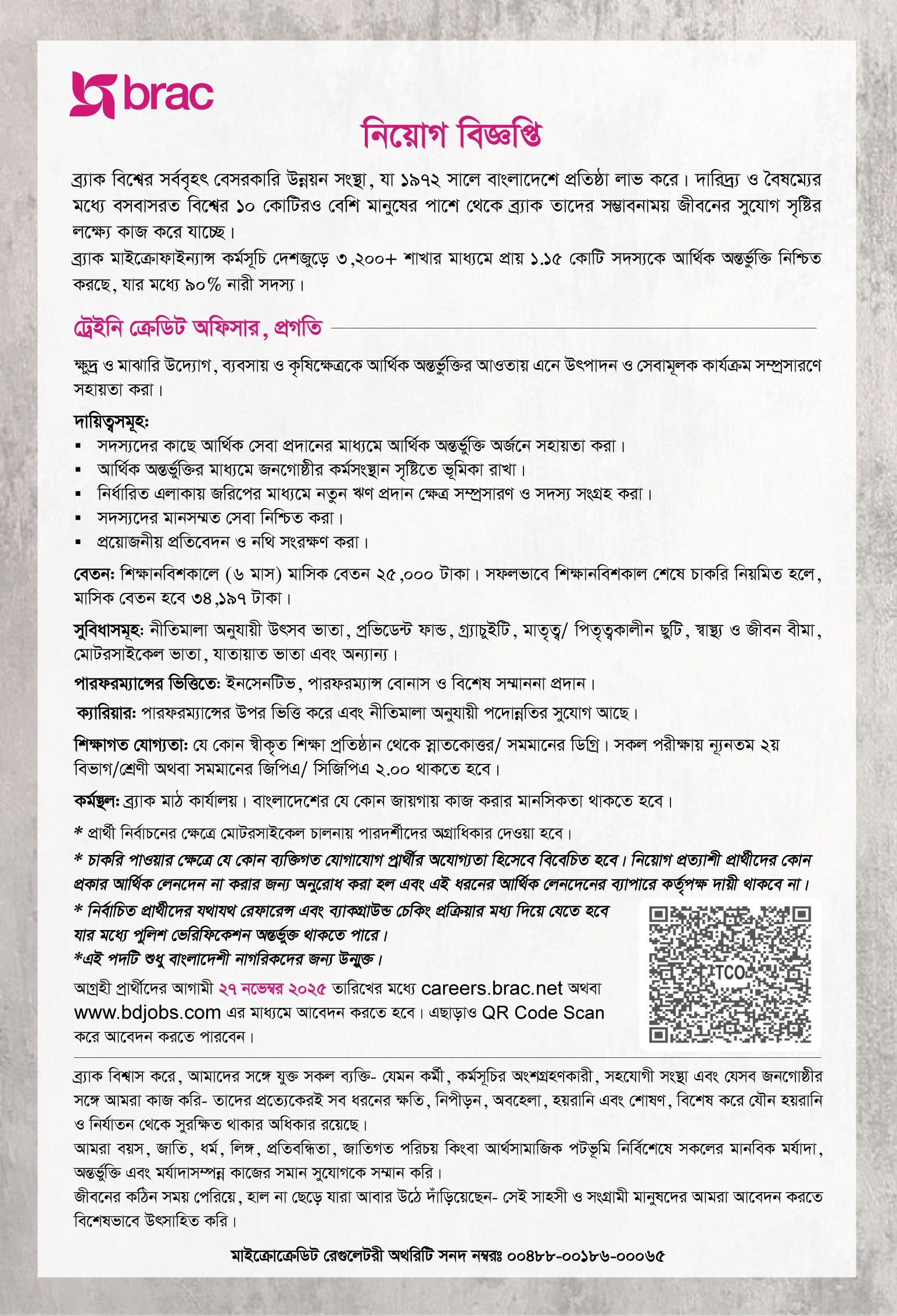 আগ্রহী প্রার্থীদের আগামী ২৭ নভেম্বর ২০২৫ তারিখের মধ্যে careers.brac.net অথবা www.bdjobs.com এর মাধ্যমে আবেদন করতে হবে। এছাড়াও QR Code Scan করে আবেদন করতে পারবেন।