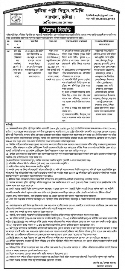 কুষ্টিয়া পল্লী বিদ্যুৎ সহিতিতে নিম্নবর্ণিত শূন্য গাদ স্থায়ী পদের বিপরীতে লোকবল নিয়োগ/প্যানেল তৈরীর নিমিয় যোগ্যতা সম্পন্ন অগ্রহী বাংলাদেশী প্রকৃত নাগরিকদের নিকট হতে নির্ধারিত ফর্মে স্বহস্তে পূরণকৃত নিম্নোক্ত শর্তাদি প্রতিপালন সাপেক্ষে আবেদন পত্র আহবান করা যাচ্ছে।